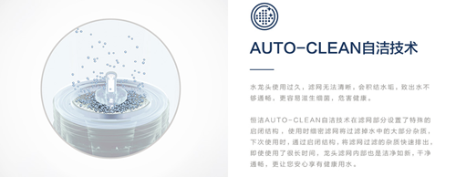 · 恒洁Auto-Clean自洁技术:能自动清洁龙头内部滤网,持久保持水路洁净与出水顺畅。